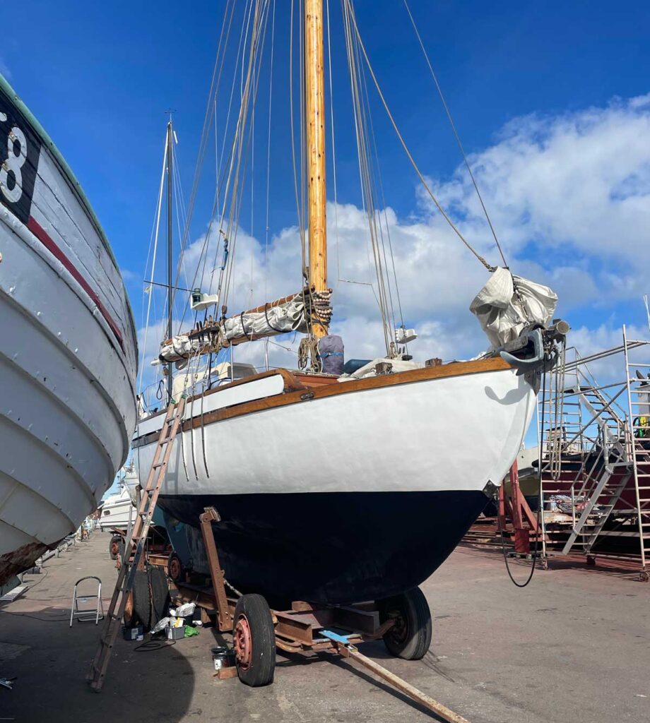 Efter en total renovering og en tur på land i Gilleje, renoveret fribord, polering af skrue, og nu med sort bund, sejler skibet nu til smukke Ebeltoft.
